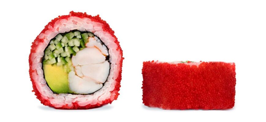 - Обваляйте готовый рулет в икре масаго, после чего нарежьте его острым ножом на 6–8 равных частей.